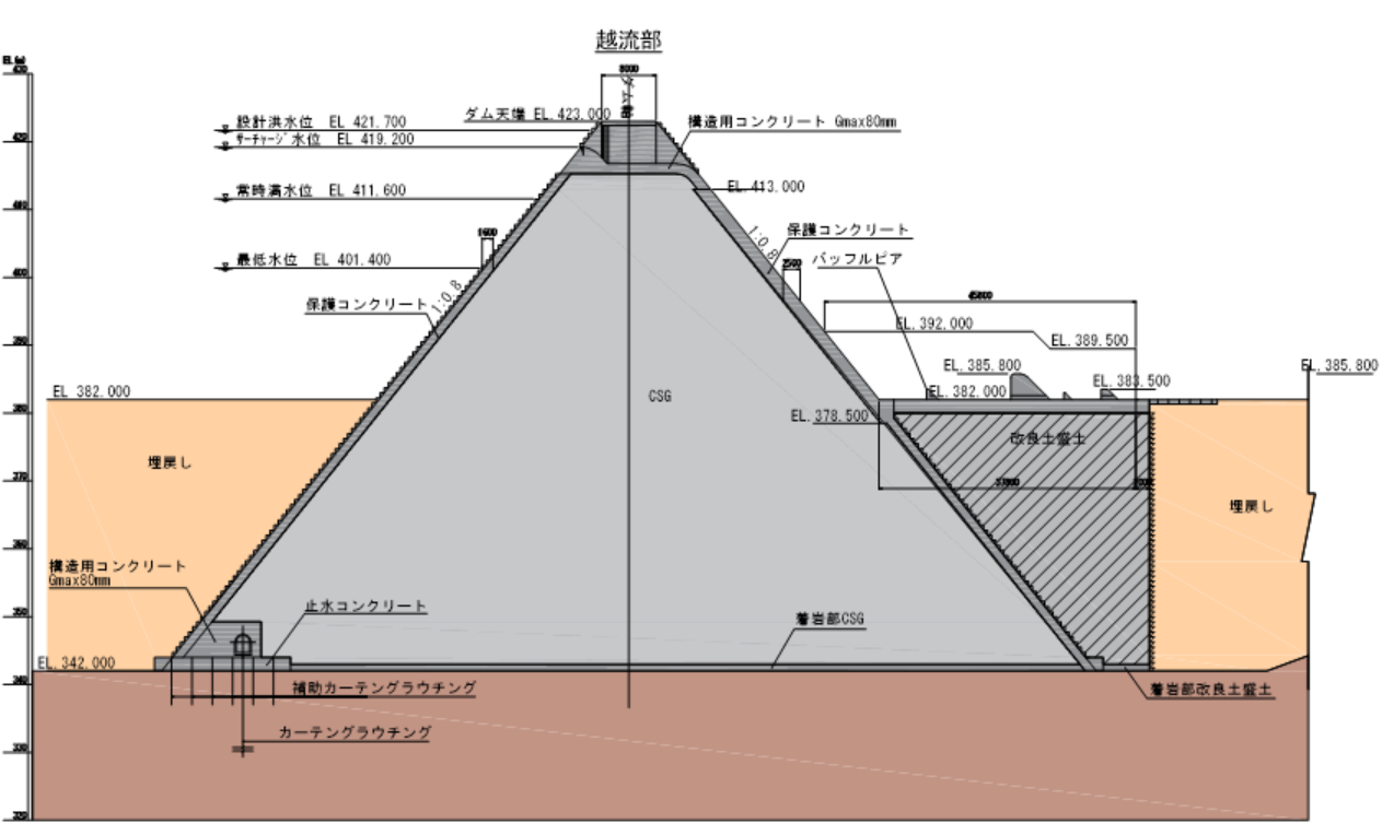 工事内容 | 本体基礎掘削工V=約845,000㎥(全体:約845,000㎥) 材料採取工V=約3,596,000㎥(全体:約3,596,000㎥) CSG打設V=約1,162,000㎥(全体:約1,470,000㎥) コンクリート打設V=約109,000㎥(全体:約242,000㎥) 基礎処理工L=約21,000m(全体:約44,000m) 法面工1式、濁水処理設備運転工1式、雑工事1式、仮設工1式 |