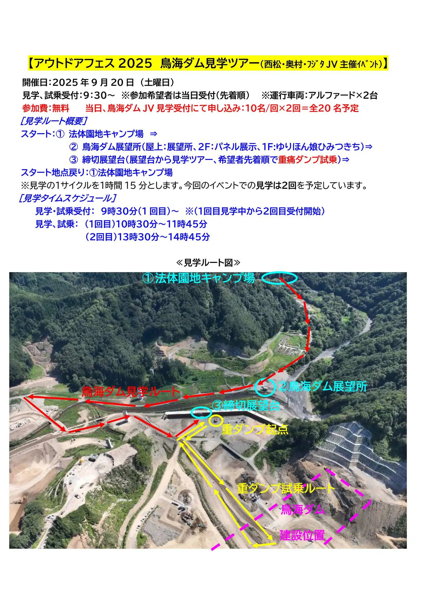 2025年8月29日 鳥海ダム見学ツアー&重ダンプ試乗会開催決定のお知ら この度9月20日(土)に開催される由利本荘市主催の『アウトドアフェス』にて、鳥海ダム見学ツアーを行うことが決定いたしました。 当日はツアーと併せてダンプ試乗体験も行います。こちらは当日受付(先着順)で、定員20名となります。 盛況であれば規模を大きくして10月にも行う予定ですので、ご来場お待ちしております。 ← 前の記事へ カテゴリー一覧 次の記事へ →