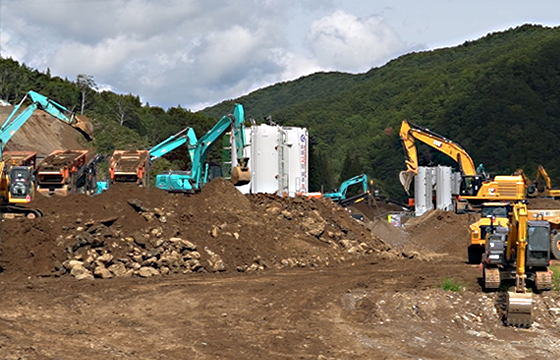 現在は、付替道路工事の他、ダムサイト上下流の仮締切工事、ダム天端標高より上部の左右岸掘削工事、本体工事用道路工事等を施工しています(写真 -1)。